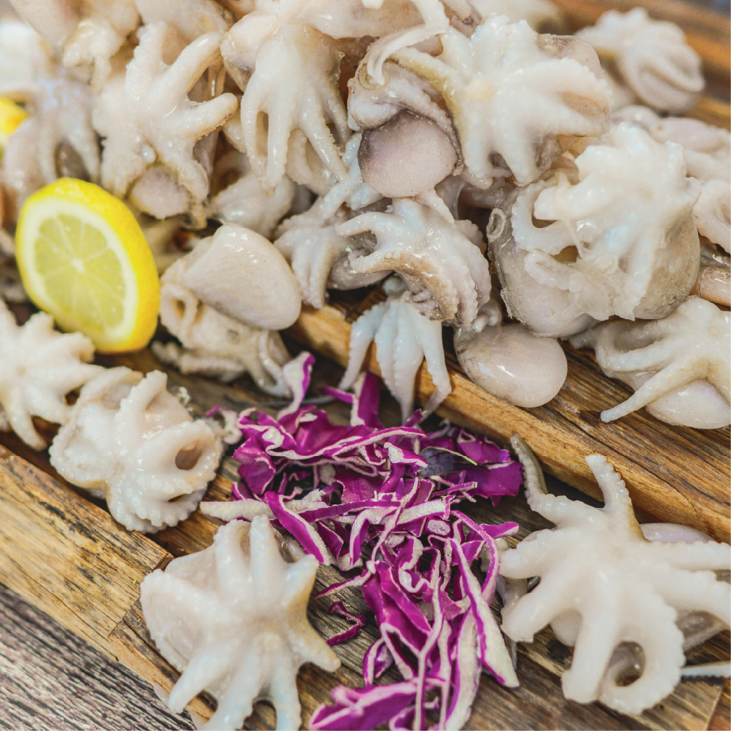 Pulpo de textura tierna y sabor elegante, con notas marinas bien definidas. Queda exquisito a la plancha con pimentón y aceite de oliva, o en ensaladas templadas. Perfecto para compartir en tapas y platos de inspiración mediterránea.
